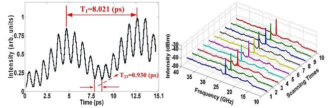 為 了克服以上困難,武漢光電國家實驗室(籌)光電子器件與集成研究團隊的孫軍強教授和趙亮博士經過兩年的潛心研究,首次發現了高非線性光纖中的相位鉗位效 應,即利用強的自相位和交叉相位調制使得相位固定在某一個值,利用低效率的四波混頻效應來抑制相位的抖動,使得從不同激光器激射的非相干光實現了相位同 步,進而得到了穩定的微波信號。在理論上,我們導出了實現相位鎖定的條件,并且在實驗上驗證了這一結果。下圖顯示了穩定的微波信號在自相關儀和電譜儀中的 測量結果。