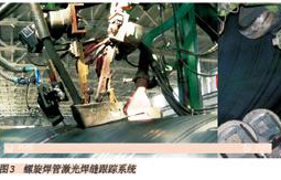 螺旋焊管主要用于油氣管道、水管以及樁管。與直縫焊管不同,螺旋焊管為連續生產,這就意味著激光跟蹤系統能夠連續長時間穩定可靠的工作。圖3給出了 寶雞石油鋼管有限公司的螺旋焊管激光焊縫自動跟蹤系統。迄今為止,國內的寶雞鋼管廠、中原焊管、中石油管道局鋼管廠、金州管道、寶世威鋼管廠都應用了類似 的激光焊縫跟蹤系統。