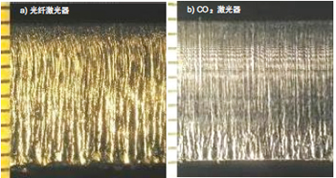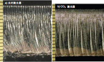 圖4顯示了使用類似加工 參數的光纖激光器和CO2激光器在加工10毫米厚的不銹鋼中獲得的典型切割邊緣質量。與光纖激光器相比,CO2激光器可獲得更卓越的切割邊緣質量。利用高 光度的光纖激光器在高速切割厚型鋼材時產生的狹窄切縫實現有效的熔融噴射是有難度的,結果造成切割邊緣質量的下降。