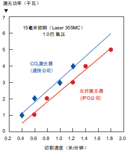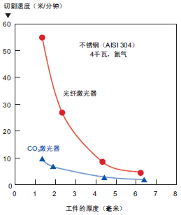 光纖激光器切割在切割薄型金屬的時候,相比CO2激光器有明顯的速度優勢,如圖1所示。從圖2和圖3中可以看出,在所標明的切割速度下,光纖激光器切割比 CO2激光器所需要的功率要低,說明工件材料所吸收的光纖激光器光束更多,從而提高光纖激光器光束的融化速度。表1中呈現的是圖2和圖3光纖激 光系統應用中的規格。光纖激光器的速度優勢在切割厚型金屬的時候并不明顯。對于較大的工件厚度(大于4毫米),光纖激光器切割速度下降到一個相當于CO2 激光器切割速度的水平。從本質上講,光纖激光器切割大型厚工件的速度大幅下降,主要歸因于光纖激光器輻射的吸收機制。金屬部件對光纖激光器輻射的吸收性在 其厚度較小的時候達到最高值,隨之變厚時而下降;相反CO2激光器的輻射吸收性隨著加工金屬部件的厚度增加而增強,在加工部件厚度達到最高的時候吸收性也 隨之達到最高值。