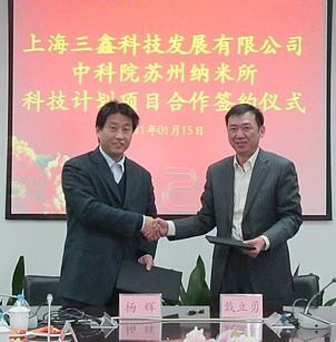 1月15日,在上海市科委的支持和雙方前期深入的溝通下,蘇州納米所與上海三鑫科技發展有限公司就共同開展“氮化鎵基藍光激光器工程化技術”項目正式簽約。楊輝所長代表蘇州納米所與三鑫公司副總經理戴立勇簽訂了合作協議。
