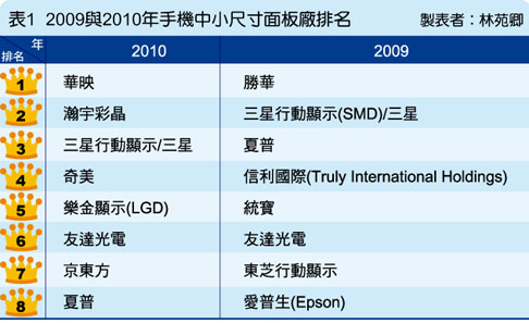 根據光電科技工業協進會統計,2009年前八大應用于手機的中小尺寸面板廠排名,在2010年排名出現大變化(表1),華映躍居為龍頭,其他瀚宇彩 晶、奇美亦后來居上,顯見臺灣面板廠在調整產品組合后,如友達光電將重心移往高毛利的可攜式導航裝置(PND)、華映與瀚宇彩晶積極搶進手機市場等策略奏 效,市占排名迅速竄升,甚至讓韓系大廠望塵莫及。