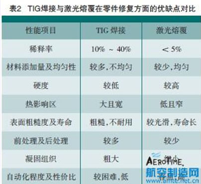 與目前普遍采用的氬弧堆焊、電弧釬焊、線性摩擦焊、電鍍、等離子及電子束堆焊等修復技術相比,激光快速成形技術具有修復精度高、對基體的熱輸入和熱影響小、修復層及界面組織性能優越、自動化程 度高等優點,在航空、電力、石化、冶金、汽車等領域高附加值零件高質量修復方面具有廣闊的應用前景[19-21]。沈陽大陸集團成功將激光熔覆技術應用于 各類渦輪動力設備關鍵部件的修復,取得了巨大的經濟效益。表2給出了TIG焊接與激光熔覆在零件修復方面的優缺點對比情況,正是由于激光熔覆在保證零件修 復質量方面的優勢,目前正在逐漸代替TIG焊接,成為航空發動機零件修復的重點和激光快速成形技術應用的重要方向,得到了研究及應用部門的高度重視。#p#分頁標題#e#