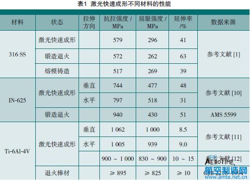美國首先于1995年提出高性能金屬零件的激光快速成形技術,在能源部研究計劃支持下,Sandia及Los Alomos國家實驗室率先發展出稱為LENS(Laser Engineered Net Shaping)[4]及DLF(Directed Light Fabrication)[5]的技術,研究了不銹鋼、鎳基合金、鈦合金、難熔金屬等材料的組織及性能,并采用該技術成功制造出錸及銥的噴管[6],顯示出 該技術在高性能金屬零件直接成形方面的優勢,并于1998年由Optomec公司成功推出商業化的LENS系統。隨后美國的Stanford University、University of Michigan、英國的University of Birmingham、University of Manchester、University of Liverpool及加拿大的National Research Council等也發展了分別稱作為SDM(Shape Deposition Manufacturing)、DMD(Direct Metal Deposition)、DLF(Direct Laser Fabrication)、DLD(Direct Laser Deposition)、LDC(Laser Direct Casting)、LC(Laser Consolidation)的技術[7-11],盡管各自的名稱不同,但原理和方法是一致的,系統所配備的激光器主要有CO2氣體激光器、Nd:YAG固體激光器(solid laser)及光纖激光器,所成形的材料包括各種不銹鋼、鎳基合金、鈦合金等。相關研究表明,激光快速成形的金屬零件具有致密、細小的組織,成分均勻,力學性能達到或超過鍛件水平[10-12],表1為激光快速成形不同材料的力學性能。