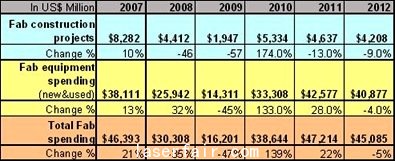 SEMI產業研究資深經理曾瑞榆表示:今年晶圓廠總支出將可接近472億美元,不但高于2010年386億美元的總支出。同時也超越2007年的晶圓廠總支出高峰464億美元的成績。下表一明列出了各年度的晶圓廠建置與設備支出數字。