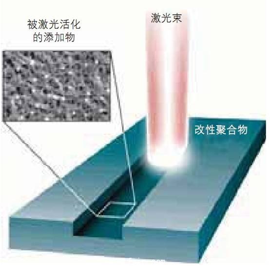 2:激光直接成型(LDS)刻蝕高分子材料,進而創造出一個活化的粗糙表面,以易于實現金屬鍍層。