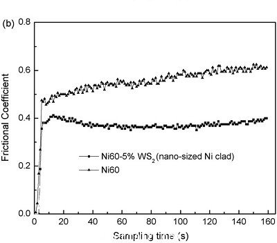 圖1為熔覆層的組織形貌,可以看出熔覆層內存在大量納米尺度的h-WS2和WC相,其摩擦磨損結果見圖2所示。