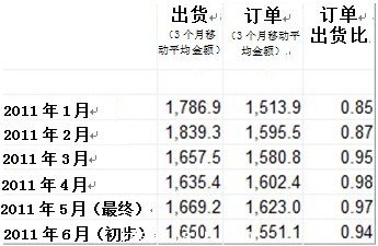 國際半導體設備與材料協會 (SEMI)于7月19日公布的六月份訂單出貨比報告顯示,2011年6月份北美半導體設備制造商接獲訂單的3個月平均金額為15.5億美元,訂單出貨比為0.94。0.94意味著當月設備出貨總金額與當月新增訂單總金額的比值為100:94。