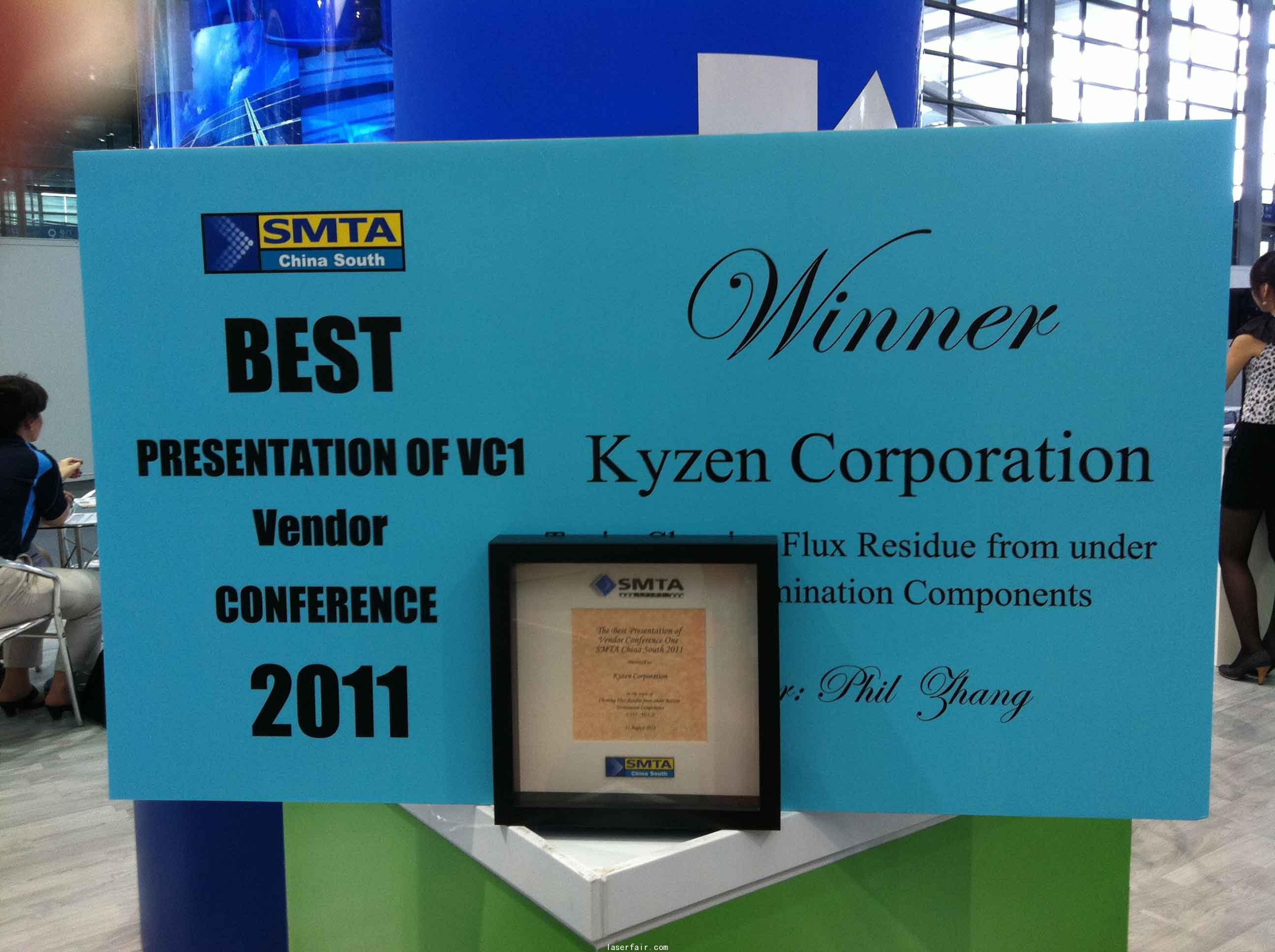 為電子和高科技制造業提供環保精密清洗產品的領導廠商Kyzen公司日前宣布,其中國區銷售經理張峰榮獲了SMTA 華南高科技設備技術研討會的最佳演繹獎(CS11)。該頒獎儀式于2011年8月31日在深圳麗思卡爾頓酒店舉行。