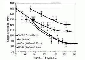 下圖畫(huà)出了三種裁焊拼板化合物的S-N曲線。從圖中可以看出W-Car和MC-DI裁焊拼板的疲勞極限大約為85MPa。這個(gè)鍍鋅的極限值低于不鍍鋅或者GMX裁焊拼板(120MPa)和底座金屬(110MPa)。下表羅列了用于組成裁焊拼板的底座金屬的拉伸特性。從表中我們可知較厚和較薄的裁焊拼板對(duì)GMX,W-Car,MC-DI產(chǎn)生的強(qiáng)度分別為185 MPa和156 MPa, 160 MPa和159 MPa, 155 MPa和146 MPa。考慮到鋼板厚度[10]中觀察了產(chǎn)生強(qiáng)度的相似趨勢(shì)。以延展百分比為特征的延展性是相似的,對(duì)于不同的材料它的變化范圍為45%到50%。獲得的三種裁焊拼板和底座金屬的薄鋼板最終拉伸強(qiáng)度對(duì)GMX,W-Car,MC-DI和BM分別為301,305,297,324 MPa。最終拉伸強(qiáng)度將要用于相關(guān)裁焊拼板的疲勞極限。