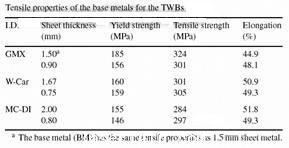 研究中所選擇的材料是IF鋼(退火和熱蘸鍍鋅)和低碳鋼(冷卻包箔和退火)。選擇是基于大量激光焊接的實(shí)際生產(chǎn)部件。基于部件的名字,三種不同的裁焊拼板工藝組合命名為GMX,W-Car和MC-DI。