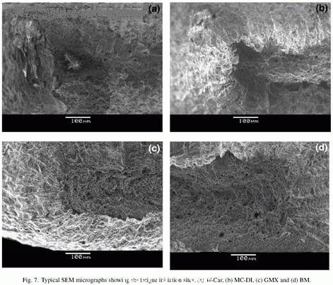 這些SEM觀察表明鍍鋅W-Car和MC-DI裁焊拼板中的低疲勞極限是晶粒破裂的結(jié)果。正如3,2節(jié)末尾所討論的,是由鋅滲透入鋼板表面之下所引起的。這與上面提到的表面條件的確是影響材料疲勞壽命的主要因素之一的發(fā)現(xiàn)相一致。