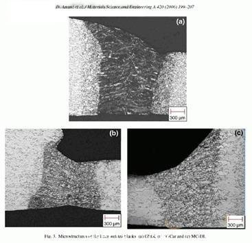 2.4機(jī)械測(cè)試和金屬斷面的顯微鏡觀察 Vickers所做的微硬度測(cè)試表明與單個(gè)底座金屬相比,交叉連接處裁焊拼板具有更高的硬度(圖)。在測(cè)試的三種裁焊拼板化合物中,我們發(fā)現(xiàn)分別與底座金屬比較,焊接珠的硬度是它們的2.5倍。正如其他的研究者所報(bào)告的一樣,這是由于激光焊接#p#分頁(yè)標(biāo)題#e#加工局部熱量輸入特性引起的。比較不同焊接工藝在熱蘸鍍鋅低碳鋼上的效果,Lazzarin et al指出在焊接時(shí)激光焊接比搗碎焊接具有更高的硬度。Rhee et al指出焊接珠的硬度是相似或者不相似厚度底座金屬鋼板硬度的2.3倍。Lee et al指出激光焊接產(chǎn)生最窄的焊接區(qū)域,電波束焊接產(chǎn)生的區(qū)域是它的1.5倍,搗碎焊接產(chǎn)生的區(qū)域是它的4倍。他們同時(shí)也發(fā)現(xiàn)激光焊接的微硬度峰值要高于電波束焊接和搗碎焊接。然而,焊接中產(chǎn)生較高硬度的原因卻沒(méi)有說(shuō)明。 IF鋼和低碳鋼正常情況下包含微量合金元素,例如含有0.01%的鈦和0.02%的鈮。通過(guò)微觀結(jié)構(gòu)更新,固態(tài)溶解增強(qiáng)和快速淬水加入這些微量元素有利于增強(qiáng)強(qiáng)度和可淬性。這樣形成的鋼板的典型微觀結(jié)構(gòu)由嵌入鈦和鈮的碳化物的鐵酸鹽矩陣構(gòu)成。由于晶體分解鐵酸鹽具有不同的形態(tài),研究表明多邊形鐵酸鹽具有等軸晶粒組成的多齒和低斷層密度。Widmanstatten鐵酸鹽是具有斷層結(jié)構(gòu)的伸長(zhǎng)魚(yú)叉;粒狀的鐵酸鹽包含有孤立的宏觀元素和高斷層密度;貝氏體鐵酸鹽由平行的鐵酸鹽條組成并具有高斷層密度。