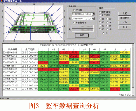 整車數據查詢是按整個車身進行查詢,反映整個車身的情況。整車數據查詢既可以按照車身的生產時間進行查詢,也可以按照車身的編號進行查詢。查詢數據的列表可以采用多種排序方式:車身編號和點號、點號和車身編號、生產時間及生產班次等。數據的顯示采用3種不同的底色來反映測量點加工誤差的大小。