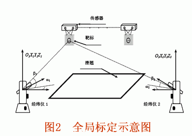 標定出從世界坐標系到傳感器三維坐標系的12個外部參數;全局標定采用的是中介坐標系方案(圖2),通過采用靶標,求出測量傳感器所對應的傳感器坐標系到經緯儀坐標系的轉換矩陣,完成坐標系的統一。
