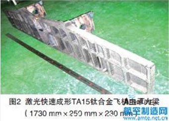 我國于1999年開始金屬零件的激光快速成形技術研究,在國家“863”、“973”計劃、國家自然科學基金重點項目等的大力支持下,集中開展了鎳基高溫合金及多種鈦合金的成形研究,形成了多套具有工業化示范水平的激光快速成形系統和裝備;掌握了金屬零件激光快速成形的關鍵工藝及組織性能控制方法,所成形的TC4、TA15、TA12等鈦合金及Inconel 718合金的力學性能均達到或超過鍛件的水平[16-18],為該技術在上述材料零件的直接制造方面奠定了基礎;近年來,我國在飛機鈦合金大型整體結構件的激光快速成形方面取得了重要突破,有效解決了激光快速成形鈦合金大型整體結構件的變形開裂及內部質量控制兩大技術難題,通過對鈦合金零件凝固組織的有效控制,所成形的飛機鈦合金結構件的綜合力學性能達到或超過鈦合金模鍛件,已通過裝機評審并得到應用[3],圖2是激光快速成形制造的TA15鈦合金飛機主承力梁。盡管取得了突破性的進展,但激光快速成形技術在成形高性能金屬零件方面仍然存在許多困難和問題。