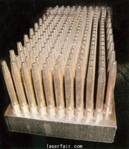 圖2 冷卻柱:通過直接金屬激光燒結僅在30小時內生成有著200個冷卻柱和內部冷流道的這種零件。在注塑過程中,冷卻柱用來更好進行冷卻和縮短生產循環時間。節省了50%的生產費用