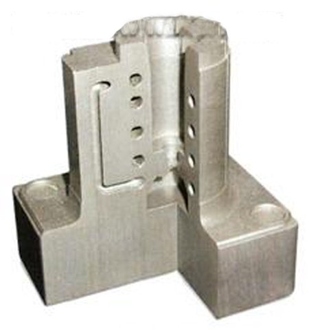 圖3 模芯:生產注塑模的模芯,也為水泵殼體提供模芯。模芯采用EOS馬氏體時效鋼MS1料并設有冷流道。這種材料的硬度可達54HRC。