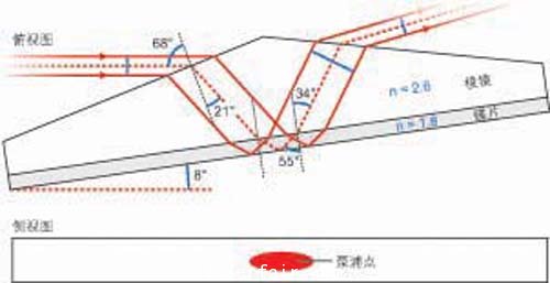 研究人員使用SiC棱鏡代替平面SiC窗口,以某一角度泵浦棱鏡/碟片復(fù)合塊,并設(shè)計(jì)棱鏡使得光束以布儒斯特角入射到復(fù)合塊的界面上(除單次全內(nèi)反射外),這意味著對(duì)p偏振的800nm泵浦光而言,所有的損耗都為零(見圖),從而解決了使用SiC所帶來(lái)的光損耗問題。棱鏡兩端的距離為40mm,頂端到底面的厚度為8.3mm;增益介質(zhì)的厚度為0.4mm。激光碟片只通過SiC棱鏡冷卻,碟片的其他面保持與空氣接觸,這樣就可以通過熱成像儀測(cè)量SiC