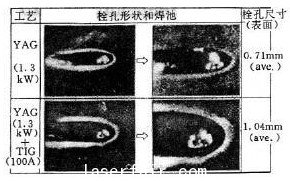 圖17示出相對焊接坡口縫隙余量的同軸TIG-YAG激光焊接的結(jié)果。僅用YAG時焊接坡口縫隙為0.4mm時,會產(chǎn)生咬邊。而同軸TIG-YAG激光焊接時焊接坡口縫隙可達(dá)0.8mm。圖18示出根據(jù)焊接焊道的斷面研究氣孔發(fā)生狀況的結(jié)果。因為保護(hù)氣體中使用了Ar,所以僅采用YAG時不可避免在部分焊道中產(chǎn)生氣孔。而同軸TIG-YAG激光焊接可以控制氣孔的發(fā)生,如圖19所示,這是因為同軸TIG-YAG激光焊接比單用YAG時栓孔上部的孔徑大,金屬蒸汽容易排出。