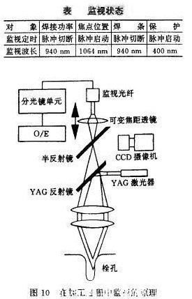 圖10示出監(jiān)視頭的構(gòu)成。監(jiān)視時,以光軸和同軸抽出焊接狀況的圖像,同時分光、探測焊接部的發(fā)光。為了使熔深加深,采用脈沖振蕩。根據(jù)焊接狀況圖像,對熔池形狀和焊接坡口線位置進(jìn)行圖像處理,并向操作人員提供視覺信息。焊接部的發(fā)光抽出,與以前所實施的采用多條監(jiān)視光纖的方法對應(yīng),因為焊接頭所要求的空間制約條件并不嚴(yán)格,用一根監(jiān)視光纖把用半反射鏡分出的光抽出。下表中示出焊接部發(fā)光的抽出方法。這里采用的是在抽出焊接參數(shù)、激光器輸出、焦點位置變化的同時,探測穿透焊接時內(nèi)部波穩(wěn)定性和焊接保護(hù)狀況。