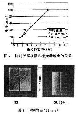 圖7示出切割板厚極限和激光輸出的關(guān)系。對0.05m/min及0.2m/min的切割速度進(jìn)行了研究。從研究結(jié)果中可以看出,切割100mm的厚板時目前需要7~8kW的激光輸出。圖8示出用3.8kW切割厚45mm的碳鋼和SUS304所得到的切割剖面。從圖中可以看出,可進(jìn)行彎曲幅度在2mm以下的高質(zhì)量分離切割。圖9示出板厚100mm時的圓錐狀樣品的切割結(jié)果。因此,如果板增厚,不可避免地會增大切割彎曲幅度。今后,應(yīng)該研究通過改進(jìn)光學(xué)系統(tǒng)及切割氣體的流向來提高切割質(zhì)量。
