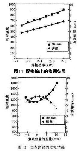 圖11示出焊接輸出的監(jiān)視結(jié)果與熔深深度的比較。從此結(jié)果中可以看出,熔深深度變化0.4mm時,就可探測到輸出功率100W左右的焊接變化。圖12示出焦點位置和YAG激光器反射光及熔深深度的關(guān)系。這里雖然采用焦點深度Bf=200mm的大透鏡,但是可以探測士4mm的熔深變化。圖13示出穿透和未穿透時的發(fā)光強度變化。穿透焊接時,因為熔融金屬在板內(nèi)穿過,所以發(fā)光強度下降,于是就能探測到可以獲得穩(wěn)定的內(nèi)部波焊道的狀態(tài)。