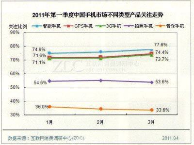 2010年,智能手機成為關注的焦點。Gartner統(tǒng)計數(shù)據(jù)顯示,2010年第一季度,全球普通手機銷量為3.147億部,同比增長17%,而智能手 機銷量同比增長48.790,達5430萬部。第二季度,全球智能手機銷量達6165萬部,同比增長50%。2010年底,智能手機用戶突破1.5億。 2011年第一季度,智能手機關注比例在中國高達76.1%(見下圖)。從第一季度的走勢來看,智能、GPs、3G手機用戶關注度呈穩(wěn)步上升走勢,智能手 機已經(jīng)成為用戶關注的絕對主流。有消息稱,2011年全球智能手機出貨量成長幅度將達33.8%,其中亞洲地區(qū)占全球手機出貨比重達27.8%,將取代北 美的27%,成為全球智能手機出貨量的最大的區(qū)域,而中國大陸2011年更可望賣出1億部以上的智能手機。有專家預測,智能手機將以每年50%的速度提 升。這意味著到2014年,中國將有一半以上的手機用戶使用智能手機終端。