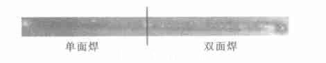在首先進行的單面焊和雙面焊的對比試驗中,發現焊縫雙面焊部分氣孔比單面焊部分要多(如圖4 所示),這是因為,雙面焊接時,第二道焊對第一道焊縫進行了部分重熔,使第一道焊縫中的氣孔中的氣體進入第二道焊縫,所以雙面焊部分氣孔增多。因此在光束擺動激光焊接對焊縫氣孔影響的研究中,均采用雙面焊。