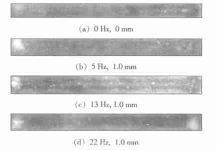 圖5 、6 所示的是光束擺動頻率對激光焊接焊縫氬氣孔的影響(X 射線透視圖),即在固定其它參數(激光功率、焊接速度、焦點位置、擺動幅度),僅改變擺動頻率。由圖5 可以看出,在擺動幅度為1.0/mm、焊接速度為1. 5 m/ min 的情況下,隨著擺動頻率的增大,氣孔減少,其中擺動頻率為22 Hz時,氣孔最少,擺動頻率為5 Hz,13 Hz 時,氣孔也有所減少,但是擺動頻率為5 Hz 的焊縫成形不符合要求,不適合實際應用。而由圖6 可知,在擺動幅度為1. 0 mm、焊接速度為0. 5 m/ min 時,隨著擺動頻率的增加,氣孔逐漸減少,頻率較高(22 Hz) 時,焊縫氣孔最少。