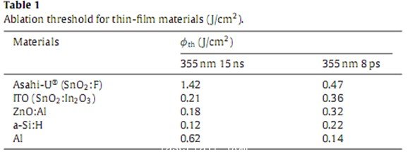在激光選擇性燒蝕過程中,確定合適的能量密度值是很重要的,這能在帶來最小副作用的情況下有效的把材料去除。燒蝕閾值對于確立可能的參數窗口是很有幫助的。燒蝕閾值是通過測量增長值燒蝕孔徑的增長值獲得的。表 1 給出了單脈沖燒蝕的燒蝕能量密度的總結。