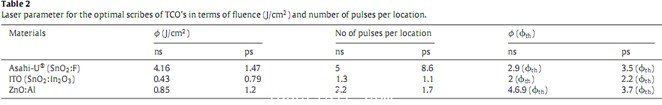 表 2 依據能量密度和每個位置的脈沖數確定的用于TCO的優化刻蝕激光參數