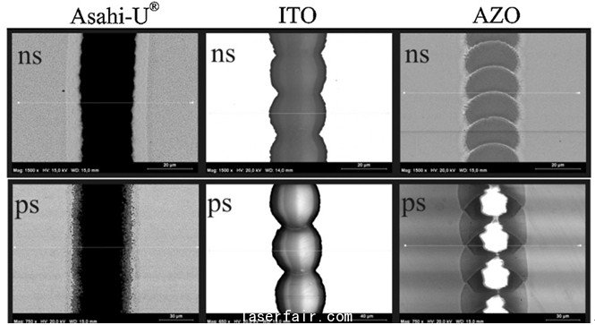 在第一步中評估了三種TCO:Asahi-U, ITO和AZO。表 2 給出了依據實現加工的必須的能量密度和脈沖數。圖 4 給出了與表2 中激光參數相應的劃線的掃描電子顯微鏡圖像。
