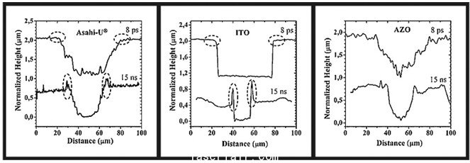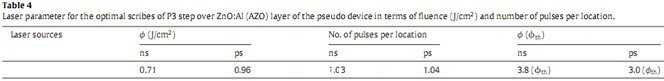 最后一步,從薄膜邊緣獲得激光整體互聯是激光劃線使靜合接點的隔離。硅結構上AZO層的完全去除用兩種脈寬實現了,并且加工參數由表4 給出。圖 給出了ns和ps輻射的最佳劃線效果。這些圖片說明了電池上TCO疊層的選擇性燒蝕成果。