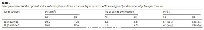 表 3 依據能量密度和每個位置的脈沖數確定的獲得非晶硅層最佳劃線效果的激光參數