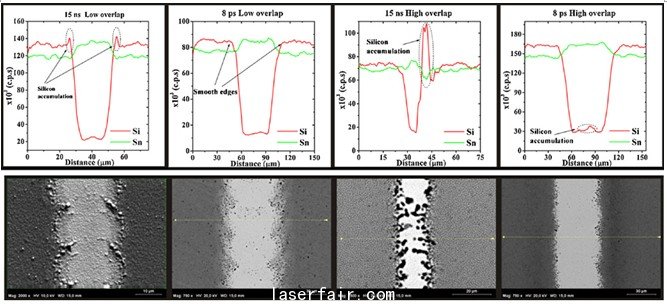 圖 7 闡明ns和ps輻射下a-Si:H(pin)/Asahi-U/玻璃的激光劃線TCO層損壞的EDX剖面和SEM圖像