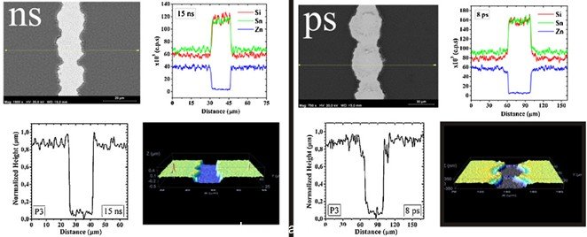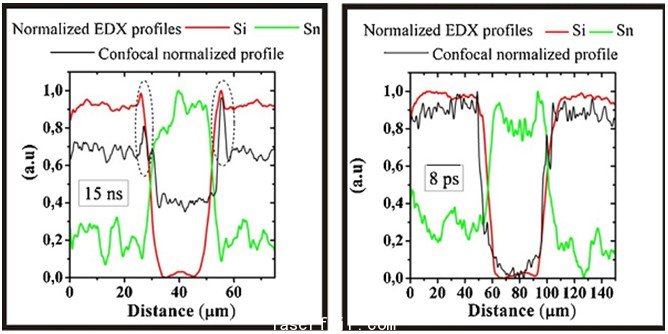 圖 6 ns和ps輻射下a-Si:H(pin)/Asahi-U/玻璃的激光最佳劃線的共焦和EDX剖面