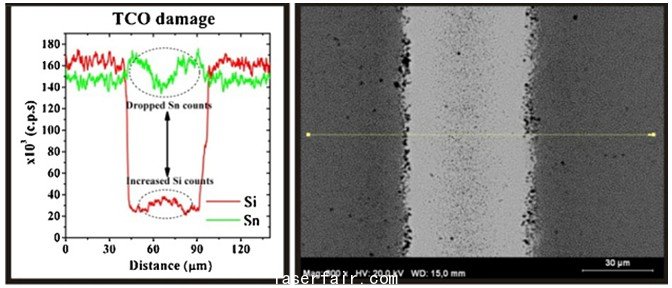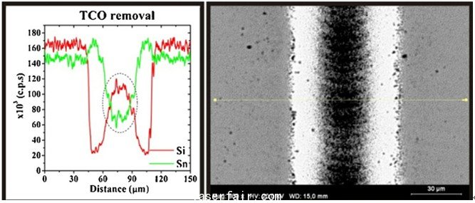 為了使凹槽邊緣的硅沉積物與它的實際高度相對應,圖 6 給出了最佳劃線的共焦和EDX剖面。圖 7 中的EDX剖面,顯示了在第二步加工中TCO層的損壞。