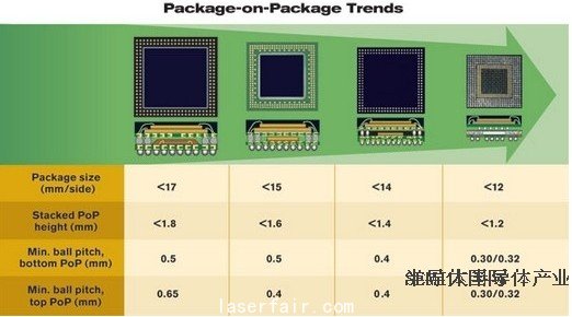 對于底層PoP封裝來說,引線鍵合正迅速被倒轉焊技術所取代。對更小封裝尺寸的要求,推動著焊球節距的不斷縮小,目前在底層PoP中,0.4 mm的焊球節距已經非常普遍。與此同時,頂層封裝的DRAM芯片,以及包含閃存的DRAM芯片,都有更高速度和帶寬的要求,這對應著頂層封裝需要具有數目更多的焊球。由于同時要求更大焊球數目和更小封裝尺寸,因而降低頂層封裝的焊球節距非常必要。在過去0.65 mm的節距就足夠了,而現在需要使用0.5 mm的節距,而#p#分頁標題#e#0.4 mm的節距也即將上馬被采用。