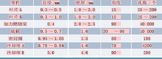航空燃氣渦輪上的葉片、噴管葉片以及燃燒室等部件在工作狀態時需要被冷卻,因此人們在這些部件的表面打上數以千計的孔,用來保證部件表面被一層薄薄的冷卻空氣覆蓋。這層冷卻空氣不僅能夠延長零件的使用壽命,還可以提高引擎的工作性能。一個典型的較先進的引擎表面會有10萬個這樣的孔,隨著打孔技術的發展,目前業界通常采用高峰值功率脈沖Nd-YAG激光器來加工,且套孔(trepanning)和脈沖鉆孔(percussion)技術已經得到了成功的應用。