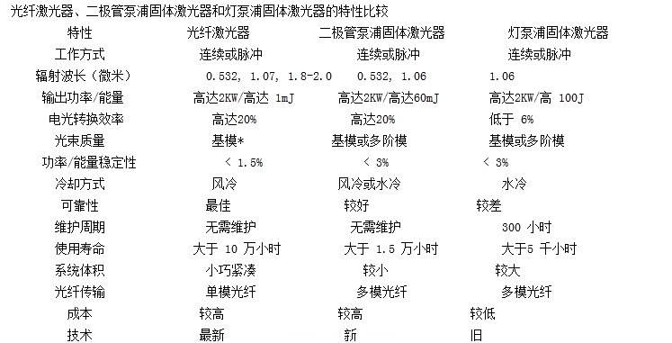 光纖、二極管泵浦固體和燈泵浦固體激光器的特性比較