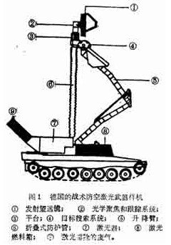 德國MBB和DIEHL公司自70年代初就開始研究防空激光武器方案,采用平均輸出功率1MW或幾MW的氣動CO2激光器。這種激光武器系統(tǒng)重約20噸,安裝在“豹-Ⅱ”坦克底座上,一般由2個人操縱即可。一個長約11.5m的升降臂,可將發(fā)射光學(xué)系統(tǒng)升至高處,以減少地面稠密大氣或戰(zhàn)場灰塵影響。樣機如圖1。根據(jù)設(shè)計,每秒射擊一次(成本約300美元)。發(fā)射出的強光束可破壞10km內(nèi)的來襲飛機、直升機、戰(zhàn)術(shù)導(dǎo)彈等,并可致盲20km或更遠的光電傳感器[6]。#p#分頁標題#e#
