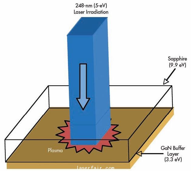 紫外激光剝離的基本原理是利用外延層材料與藍(lán)寶石材料對(duì)于紫外激光具有不同的吸收效率。藍(lán)寶石具有較高的帶隙能量(9.9 eV),所以藍(lán)寶石對(duì)于248nm的氟化氪(KrF)準(zhǔn)分子激光(5 eV輻射能量)是透明的,而氮化鎵(約3.3 eV的帶隙能量)則會(huì)強(qiáng)烈吸收248nm激光的能量。正如圖3所示,激光穿過(guò)藍(lán)寶石到達(dá)氮化鎵緩沖層,在氮化鎵與藍(lán)寶石的接觸面進(jìn)行激光剝離。這將產(chǎn)生一個(gè)局部的爆炸沖擊波,使得在該處的氮化鎵與藍(lán)寶石分離?;谕瑯拥脑?,193nm的氟化氬(ArF)準(zhǔn)分子激光可以用于分離氮化鋁(AlN)與藍(lán)寶石。具有6.3 eV帶隙能量的氮化鋁可以吸收6.4 eV的ArF激光輻射,而9.9 eV帶隙能量的藍(lán)寶石對(duì)于ArF準(zhǔn)分子激光則是透明的。