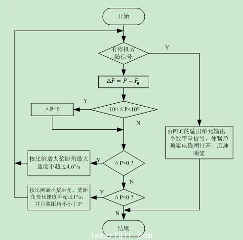 發電機并上電網后通過調節槳距角來調節發電機輸出功率,功率調節程序流程圖如圖5所示。當實際功率大于額定功率時,PLC的模擬輸出單元CJ1W-DA021輸出與功率偏差成比例的電壓信號,并采用LMT指令使輸出電壓限制在-4.1V(對應變槳速度4.6°/s)以內。當功率偏差小于零時需要進槳來增大功率,進槳時給比例閥輸出的最大電壓為1.8V(對應變槳速度0.9°/s)。為了防止頻繁的往復變槳,在功率偏差在±10KW時不進行變槳。