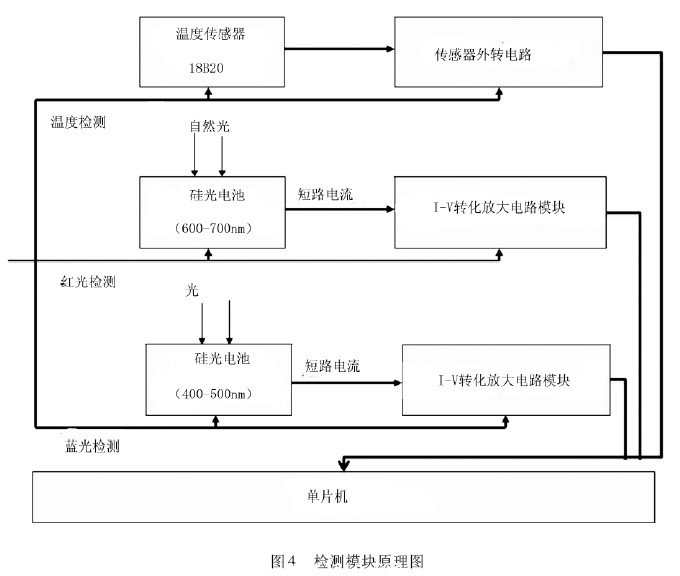 檢測模塊利用光照傳感器、溫度傳感器實時檢測設施內部光照強度和溫度,并將采集數據提供給單片機進行處理,原理圖如圖4 所示。其中,溫度檢測模塊由溫度傳感器18B20 及其標準調理電路組成,數據線接入單片機P1. 0 口,實現對溫度的采集。光照檢測包括紅光光強檢測和藍光光強檢測,采用波長范圍在400 ~ 500nm 的藍光2BU6 硅光電池和波長范圍600 ~ 700nm 的紅光2BU6 硅光電池作為檢測元件。采用4 路運算放大器LM324 設計運算放大器將硅光電池的微弱模擬信號分別進行轉換和放大,最終將模擬信號接入單片機P1. 1,P1. 2 端口進行A/D 轉換,從而實現分波段光強檢測。