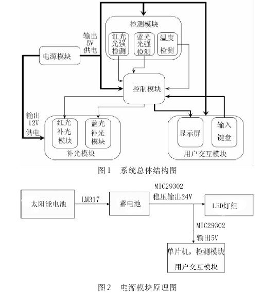 本系統采用模塊化設計,分為電源模塊、檢測模塊、控制模塊、補光模塊、用戶交互模塊,總體結構如圖1 所示。其中,電源模塊采用太陽能供電,分別提供5V,1 2V 兩種供電電壓,為整個系統供電; 智能控制模應用STC 系列單片機為核心,根據系統采集到的數據、設置閾值,實現對應PWM 控制信號的占空比計算和兩路PWM 控制信號輸出; 檢測模塊分波段檢測紅、藍光強和實時溫度,并將檢測信號進行濾波、放大后傳入單片機,實現相關環境信息的檢測; 補光模塊采用兩路帶有PWM 電流控制功能的恒流驅動電路,分別控制紅、藍光LED補光陣列燈的亮度,從而實現定量精確補光; 用戶交互模塊采用液晶屏完成檢測結果顯示,鍵盤實現按需閾值修改等功能,完成閾值修改與設置,有效提高系統使用的方便性、擴展性。