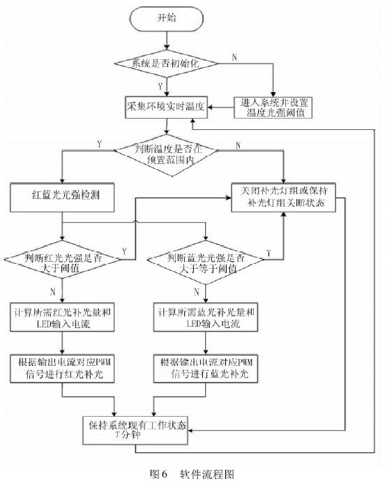 該系統軟件主要包括傳感器解析函數、數據管理與參數設定程序、PWM 信號控制程序和顯示程序,實現3 類參數設置、環境因子采集以及對受控燈組的自動控制功能,軟件流程如圖6 所示。系統工作時,首先需要對溫度,紅藍光強閾值進行設置,溫度傳感器周期對設施內溫度監測,判斷溫度是否超出不利于光合作用的閾值范圍,超出則關斷LED 補光燈組。當溫度在所設閾值范圍內,再分別對紅、藍光進行光強檢測,實際光強在閾值之內時,系統進入自動定量補光狀態,根據所設閾值與實際值之差計算實際需光量,進而再根據與實際需光量對應的兩路PWM 控制信號的占空比,分別產生對應的PWM 信號,達到控制LED 燈的亮度對植物實施精確補光的目的。
