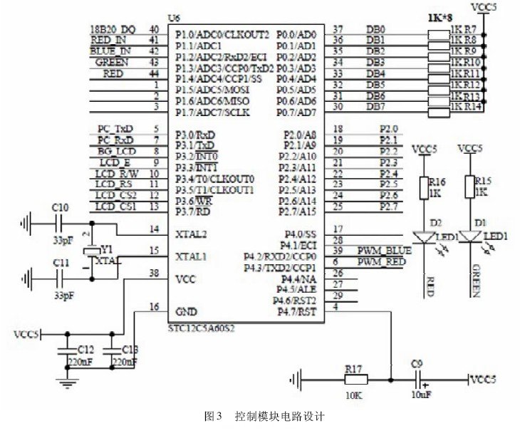 控制模塊選用STC12C5A60S2 單片機作為核心處理器,采用5V 電源供電,具有8 路10 位A/D 接口、2 路PWM 輸出口、Flash 存儲空間56K、靜態存取內存1 280B、可編程只讀存儲器1K,完成節點任務調度、數據采集、智能管理、控制信號輸出、閾值的調整、數據轉儲等工作,電路如圖3 所示。其中,P0 口連接液晶屏的8 路數據口; P1 口負責與采樣信號連接,P1. 0 接入溫度檢測信號、P1. 1 接入紅光檢測信號、P1. 2 接入藍光檢測信號,從而完成對傳感器監測數據的采集;P2 口連接4 × 4 矩陣鍵盤,P3. 0,P3. 1 用于單片機與串口連接的數據讀寫線,完成程序的下載; P3. 2 ~ P3.7 位液晶控制端; P4. 2,P4. 3 為單片機PWM 控制端輸出口,其根據單片機計算出與兩波段所需補光量對應的PWM 信號占空比,輸出PWM 信號對LED 燈組的亮度進行控制。