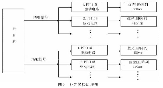 補光模塊包括LED 燈組及其驅動電路,驅動電路采用PT4115 驅動模塊電路,紅光和藍光兩個模塊獨立工作,原理圖如圖5 所示。其中,LED 燈組采用額定功率1W、中心波長為660nm 的窄帶紅光LED 陣列和中心波長為450nm 的窄帶藍光LED 陣列。由單片機輸出的兩路PWM 信號分別與紅藍光兩路PT4115的DIM 控制端相連,其中紅光驅動芯片與P4. 2 產生的PWM 信號接通,藍光則與P4. 3 產生的PWM 信號接通。利用PWM 的信號控制驅動芯片PT4115 的輸出電流,由此實現LED 燈組的定量補光。#p#分頁標題#e#