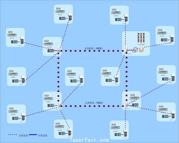 本方案主要采用研華無(wú)線AP EKI-6311G與無(wú)線串口服務(wù)器EKI-1351兩種設(shè)備。由于現(xiàn)場(chǎng)有100個(gè)PLC設(shè)備,且每臺(tái)PLC均需要采用無(wú)線方式傳輸至上位機(jī)。由于現(xiàn)場(chǎng)PLC與中控室距離較遠(yuǎn),且無(wú)線節(jié)點(diǎn)較多,為保障無(wú)線網(wǎng)絡(luò)傳輸?shù)目煽浚虼宋覀兺扑]每10臺(tái)PLC透過(guò)1臺(tái)無(wú)線AP連接,即總共需10臺(tái)無(wú)線AP。無(wú)線AP間采用WDS (Wireless Distribution System無(wú)線分布式系統(tǒng)) 技術(shù),讓無(wú)線網(wǎng)絡(luò)的多臺(tái)無(wú)線AP設(shè)備靈活的橋接,方便的把100臺(tái)PLC的數(shù)據(jù)透過(guò)100個(gè)EKI-1351傳輸至無(wú)線AP,最終再上傳至中控室的上位機(jī)。